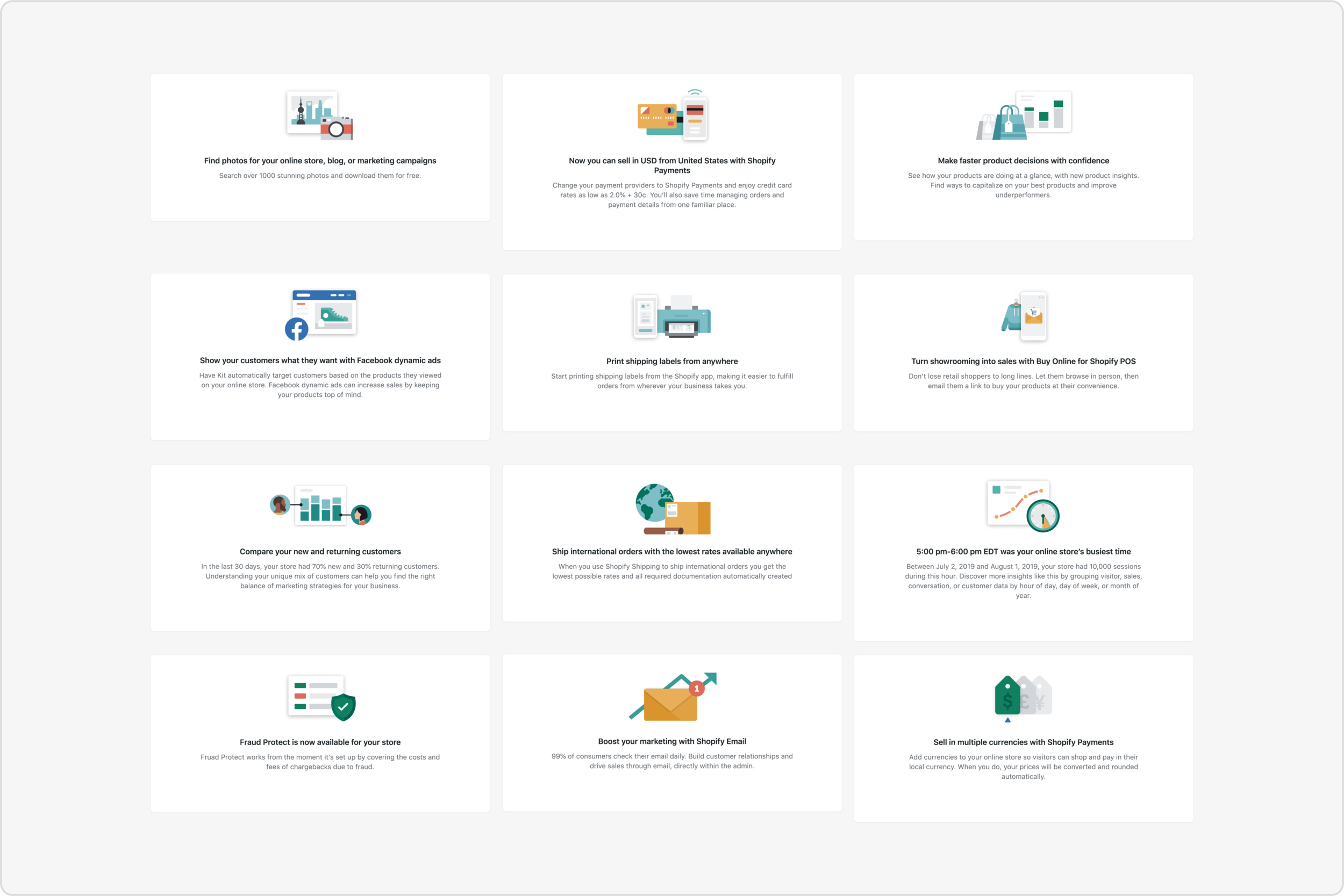 Our icon system also needed a design refresh, with very little time and resources to spare. We quickly formed a small team of designers to work through the entire library and define and test a new style. After a first pass was complete, I shifted into a focus on quality and consistency, worked through all 400+ icons to ensure everything was pixel-perfect and aligned to the new style, and collaborated with developers to ship the changes into Shopify’s Polaris Icon Library.
