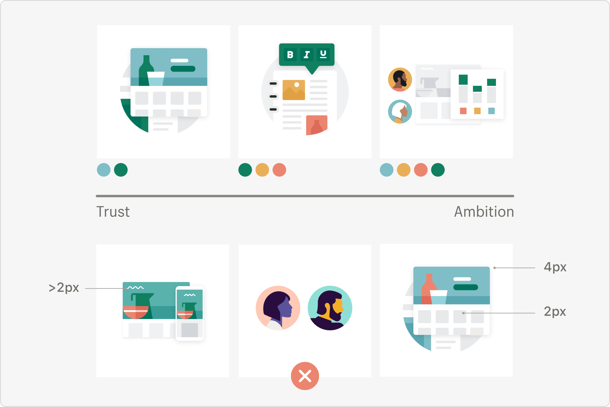 The illustration style was developed in conjunction with efforts from other others to develop a new design language for all of Shopify. The two informed each other through the process, until we landed on the skeleton of a style that we could begin building with and refine over time as new ideas and constraints emerged. A V1 style guide was built to help us define the major elements that would tie everything together.