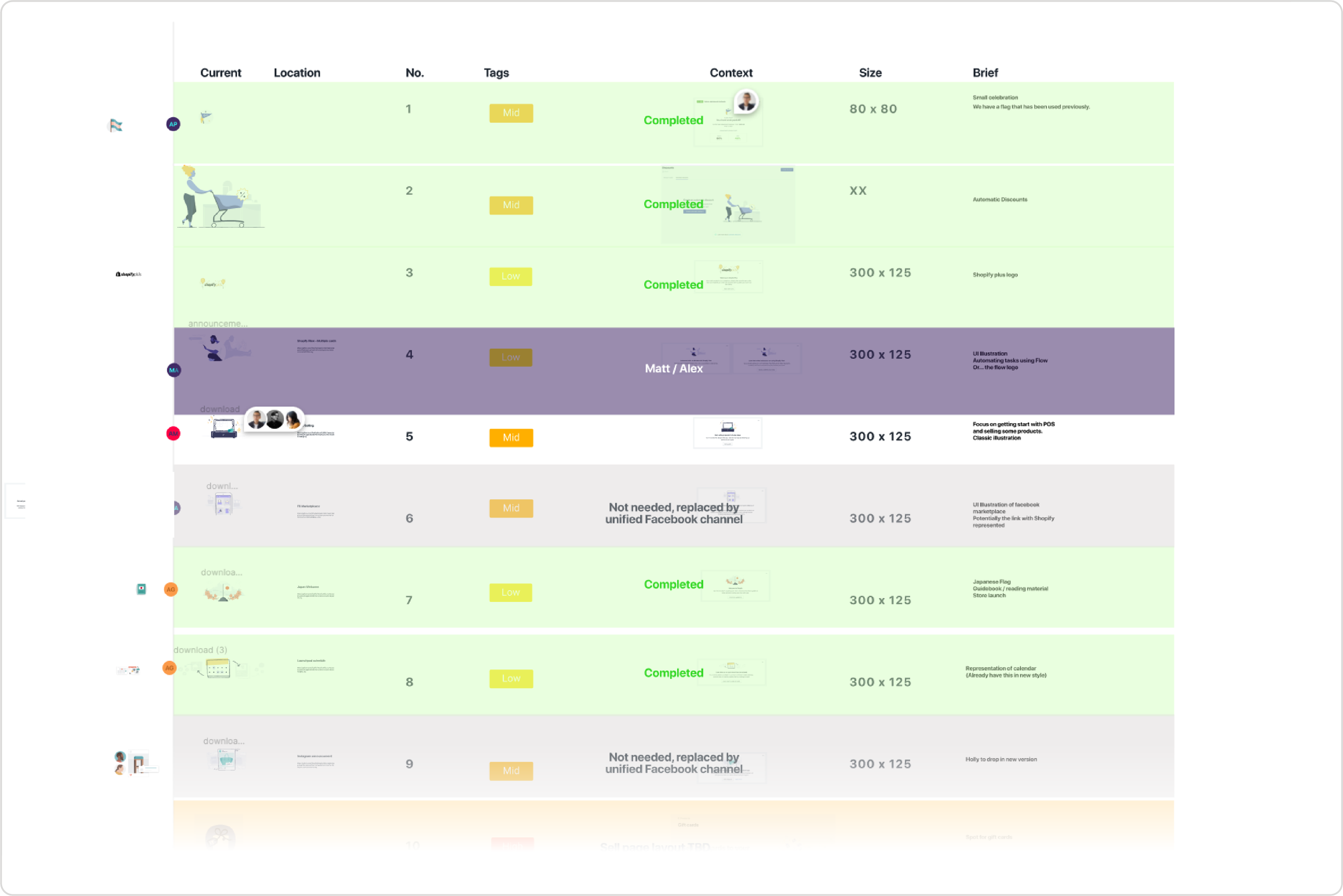 We collaborated with a small team of developers to build a custom tool that captured the visual assets in all of Shopify’s Github repos, and listed them out for manual review. From there, we populated a massive list of them all in Figma, with details of location in the product, size, and other important context. This was the hub from which we discussed options, made decisions and documented our progress as a team.